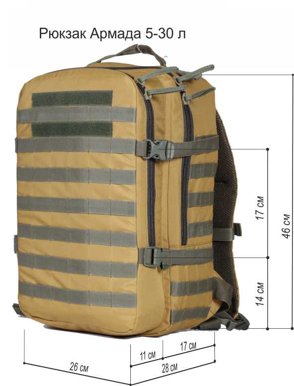 - габаритные размеры рюкзаков (ширина глубина высота в сантиметрах) соответственно вместительности — 20 л (23х22х44), 30 л (26х28х46)