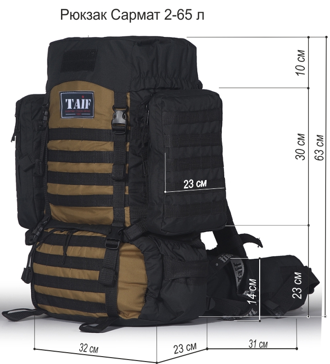 - габаритные размеры рюкзаков (ширина глубина высота в сантиметрах), соответственно вместительности 35 л (29х22х56), 45 л (30х22,5х58), 55 л (30,5х23х60 ), 65 л (34х24,5х63).