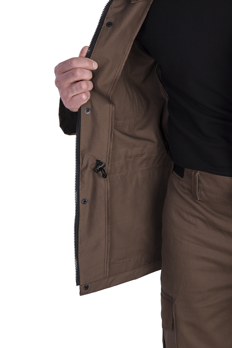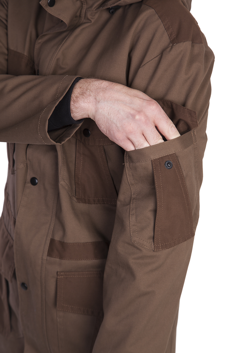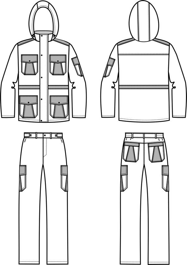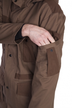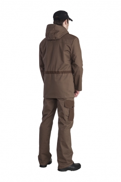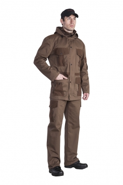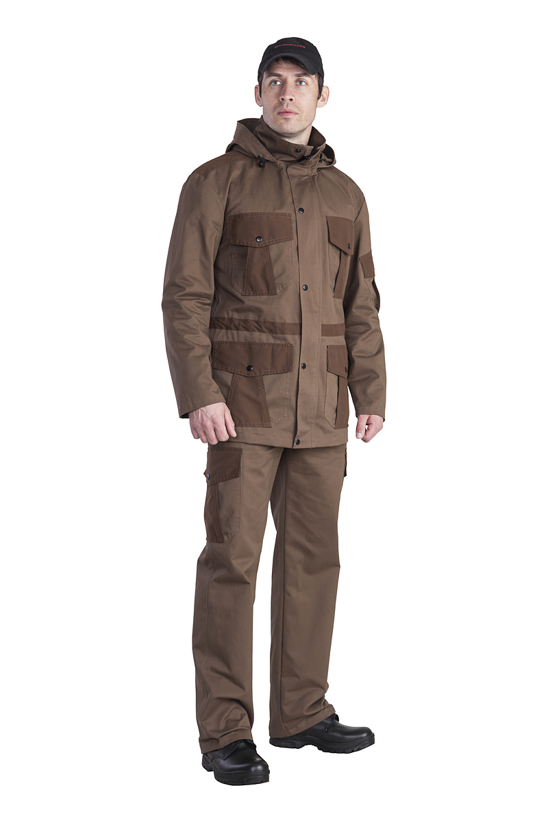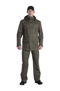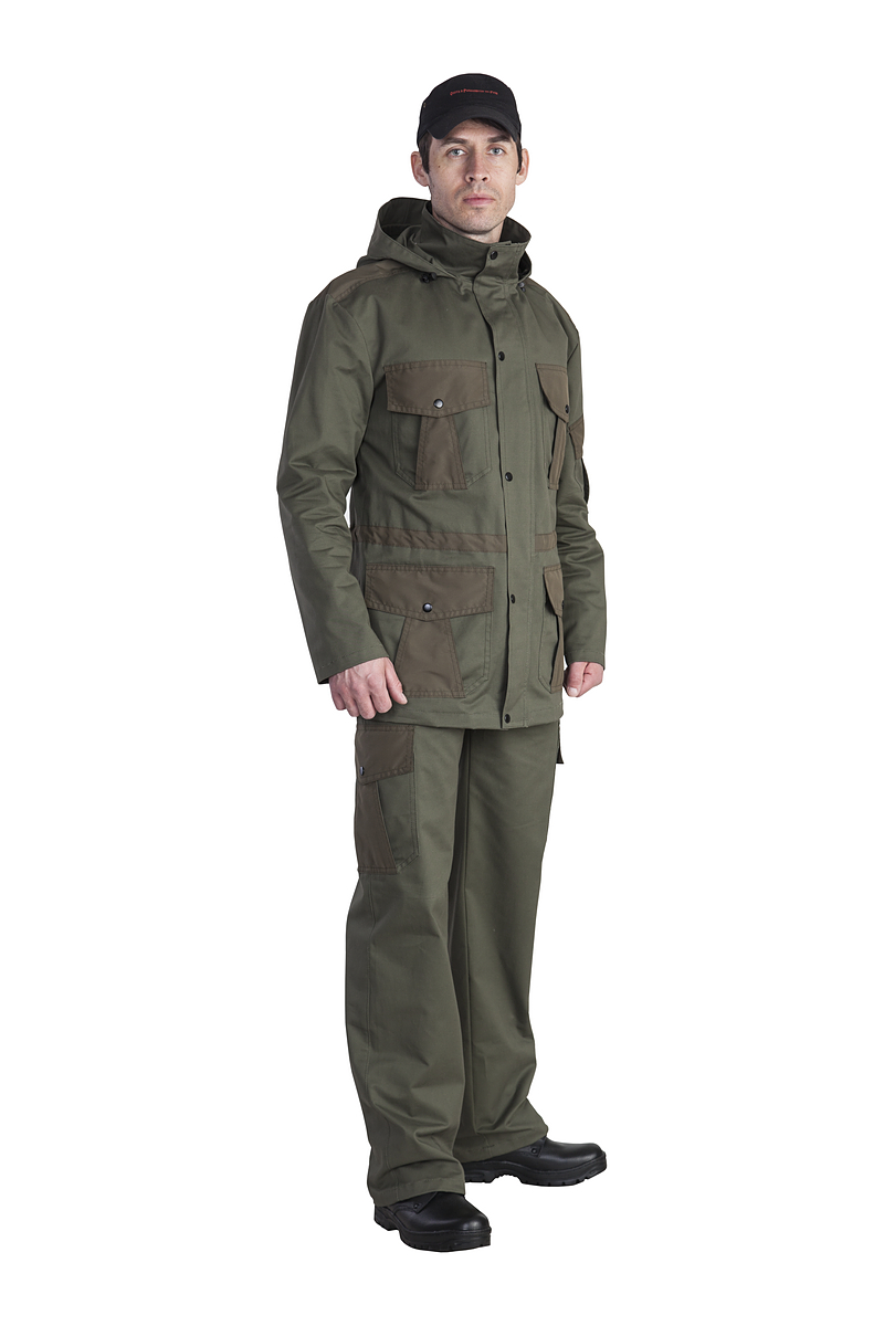 Костюм универсальный, подходит для охоты, рыбалки и прогулок на природе. Удлиненная куртка имеет четыре объёмных накладных кармана, кулиса по талии брюки на поясе с эластичной тесьмой. Основная ткань - прочный, износостойкий твилл. Эта ткань (100% хлопка) прекрасно защищает от ветра, почти мгновенно сохнет, пропускает воздух (позволяя телу «дышать»). Места повышенного износа имеют дополнительное усиление, мембранной тканью , которая не пропускает влагу снаружи, отводит ее изнутри и обладает повышенной износостойкостью.Технические характеристики
