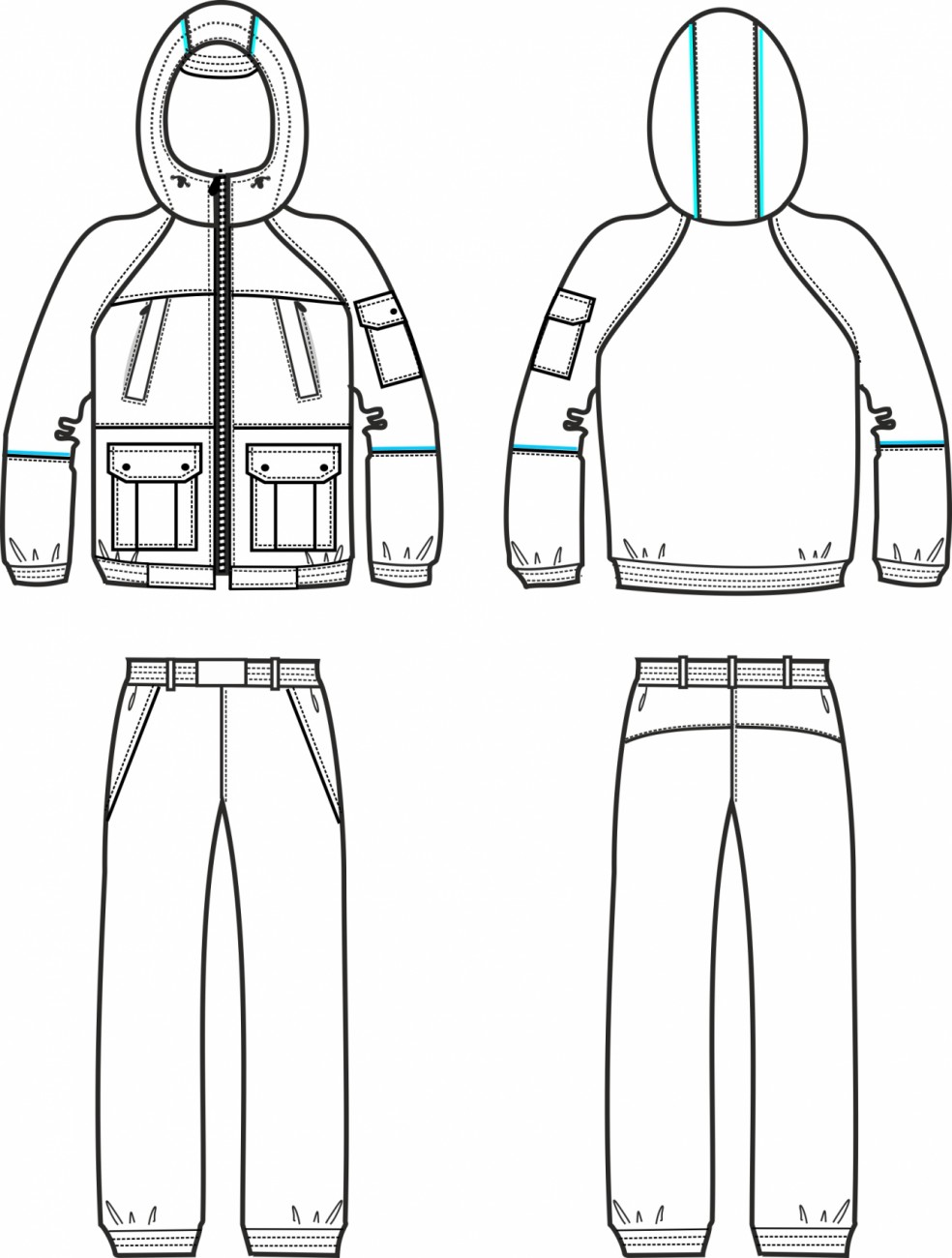 Куртка на молнии, имеет 4 кармана плюс один на рукаве, рукава на резинке и по низу куртки - эластичная тесьма. Брюки на поясе фиксируются эластичной тесьмой, она же идет по низу брюк.