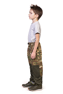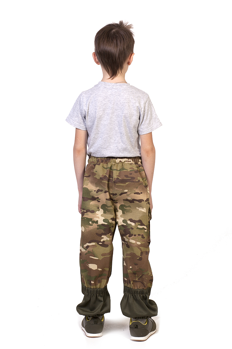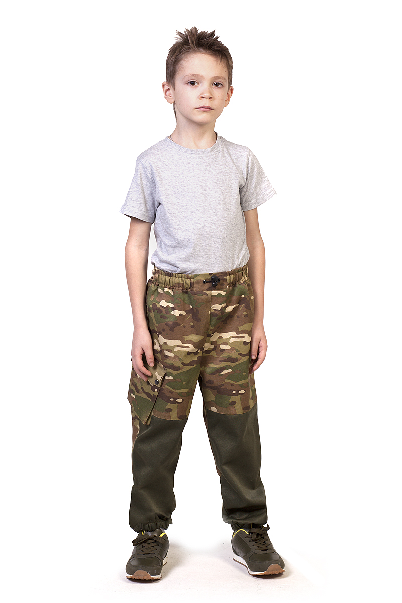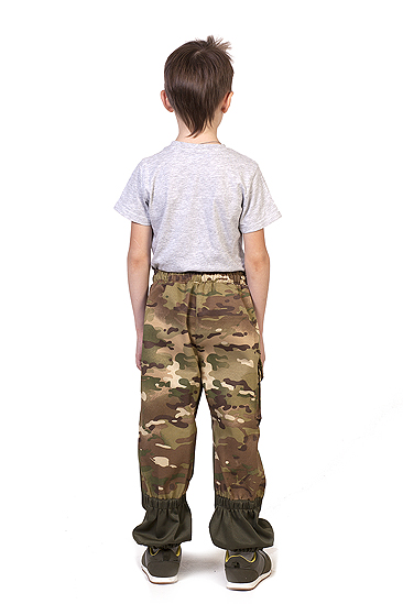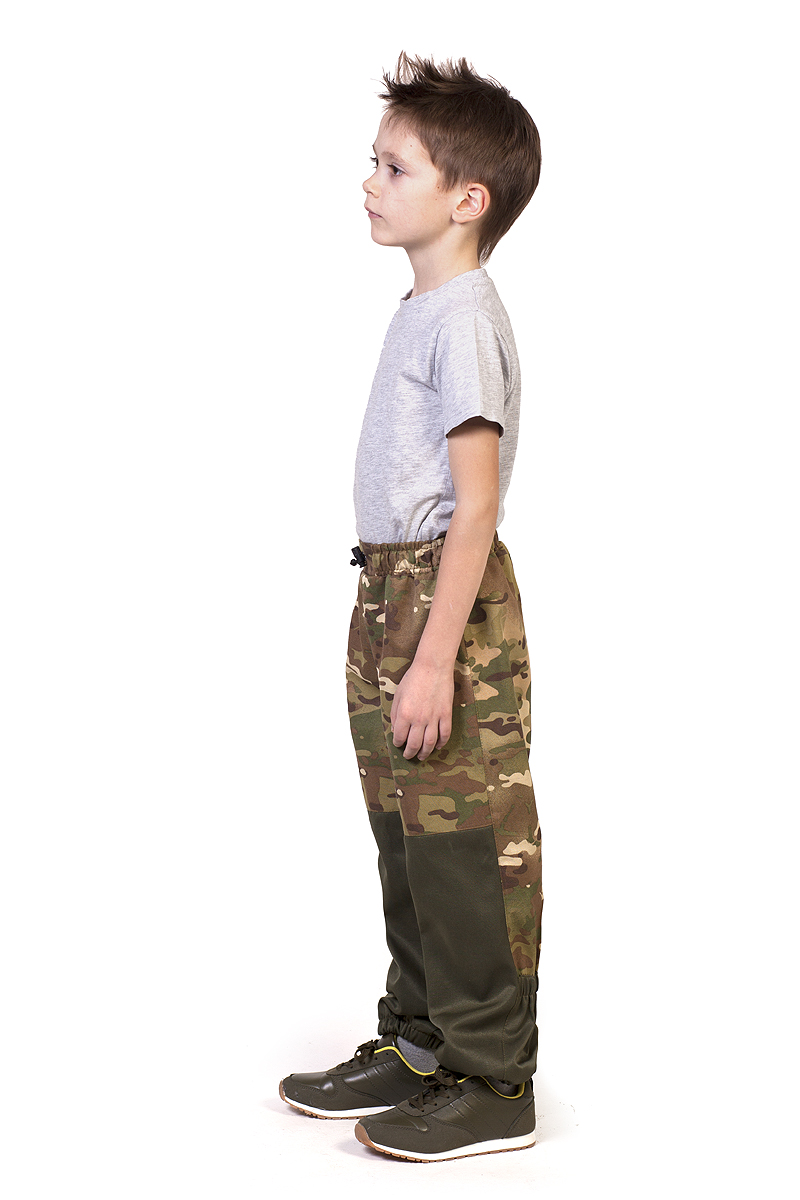 Брюки на поясе фиксируются эластичной тесьмой на шнур для регулировки объёма. В области колен есть утяжка на резинке, для хорошего облегания ног. Снабжены карманом под мелкие предметы.