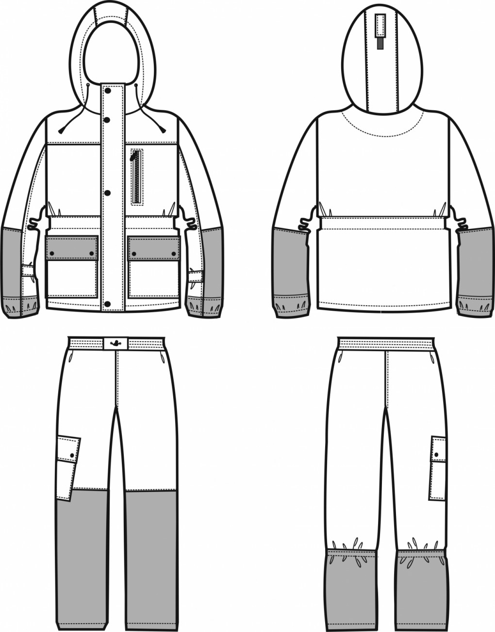 Куртка удлинённая, свободного кроя с регулируемым капюшоном. Центральная застёжка-молния под ветрозащитной планкой на кнопках. Низ рукавов на эластичной тесьме. Три кармана на куртке: два накладных на кнопках и один нагрудный на молнии.