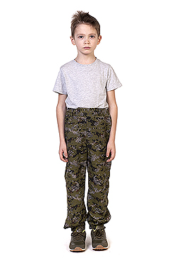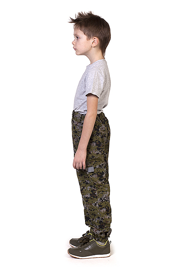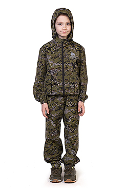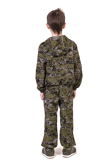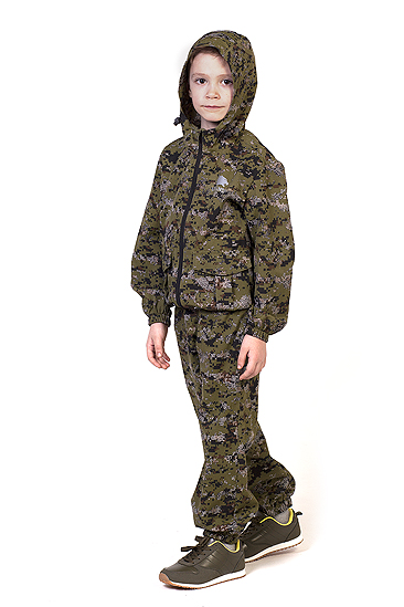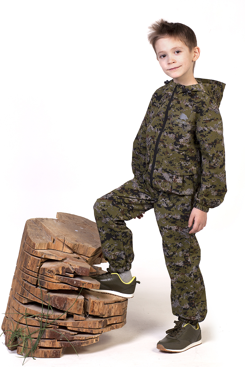 Куртка прямого силуэта на молнии, с двумя карманами и капюшоном на утяжке. Низ изделия и рукавов фиксируются эластичной тесьмой. Светоотражающие метки на куртке и брюках, и такая же эмблема обеспечат безопасность передвижения ребенка в темное время.