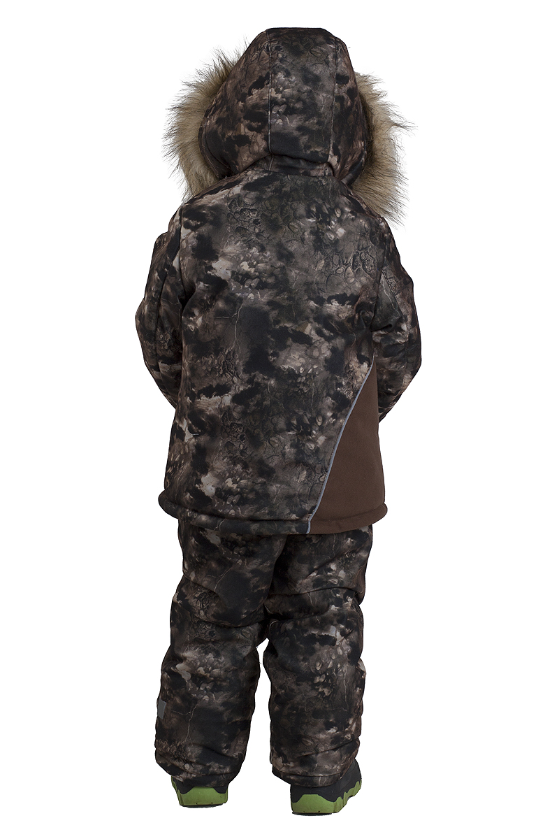 Утепленный костюм на холодную зиму, из мягкой и прочной нешуршащей ткани с дополнительной защитой от холода ветра и дождя. Утепление из синтепона и флиса в области туловища. Куртка прямого силуэта с утяжкой капюшона и отстегивающимся мехом. Трикотажные манжеты в рукавах и ветрозащитный клапан по низу куртки и брюк - обеспечат надежную защиту от холода и ветра. Отражающие метки по капюшону, куртке и по низу брюк для дополнительной безопасности ваших детей в темное время суток. Брюки на подтяжках, с резинкой в области талии и отражающими метками по бокам.Технические характеристики